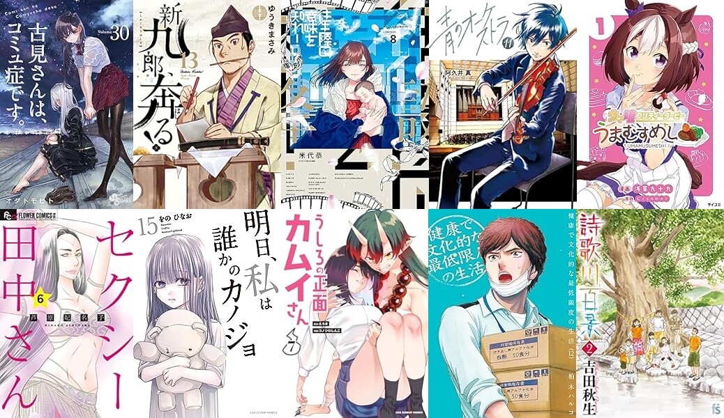 「古見さんは、コミュ症です。」「新九郎、奔る!」「往生際の意味を知れ!」「青のオーケストラ」「明日、私は誰かのカノジョ」「うしろの正面カムイさん」「健康で文化的な最低限度の生活」「セクシー田中さん」「ウマ娘 プリティーダービー うまむすめし」「詩歌川百景」「厭談夜話」「すこしだけ生き返る」「異世界ありがとう」などなど。
