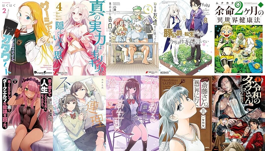 「サーシャちゃんとクラスメイトオタクくん」「真の実力はギリギリまで隠していようと思う」「10年間友達だと思ってた男の子に告白されるお話」「聖騎士になったけど団長のおっぱいが凄すぎて心が清められない」「豚公爵に転生したから、今度は君に好きと言いたい」「余命2ヶ月の異世界健康法」「家が燃えて人生どうでも良くなったから、残ったなけなしの金でダークエルフの奴隷を買った。」「不揃いの連理」「ひげを剃る。そして女子高生を拾う。」「便利屋斎藤さん、異世界に行く」「令和のダラさん」「創造錬金術師は自由を謳歌する」などなど。