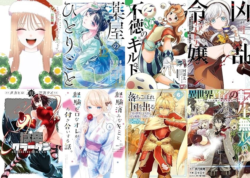 「その着せ替え人形は恋をする」「薬屋のひとりごと」「黄泉のツガイ」「不徳のギルド」「凶乱令嬢ニア・リストン」「獄卒クラーケン」「経験済みなキミと、経験ゼロなオレが、お付き合いする話。」「落ちこぼれ国を出る」「カメレオンはてのひらに恋をする。」「異世界賢者の転生無双」「勇者パーティーを追放されたビーストテイマー、最強種の猫耳少女と出会う」「スーパーの裏でヤニ吸うふたり」などなど。