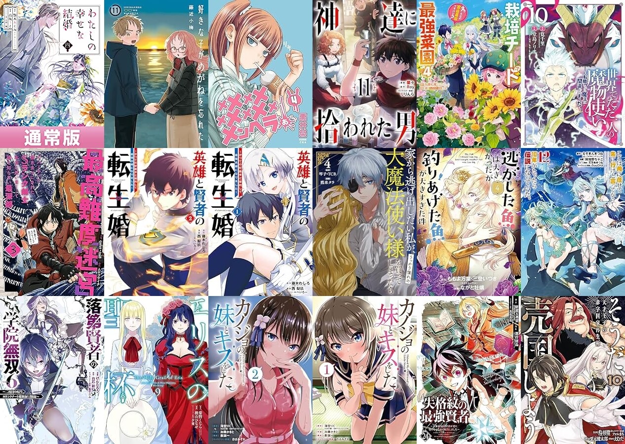 「わたしの幸せな結婚」「好きな子がめがねを忘れた」「メメメメメメメメメメンヘラぁ…」「栽培チートで最強菜園」「世界でただ一人の魔物使い」「最高難度迷宮でパーティに置き去りにされたSランク剣士、本当に迷いまくって誰も知らない最深部へ」「英雄と賢者の転生婚」「家から逃げ出したい私が、うっかり憧れの大魔法使い様を買ってしまったら」「逃がした魚は大きかったが釣りあげた魚が大きすぎた件」「ここは俺に任せて先に行けと言ってから10年がたったら伝説になっていた。」「落第賢者の学院無双」「エリスの聖杯」「カノジョの妹とキスをした。」「失格紋の最強賢者」「そうだ、売国しよう」などなど。