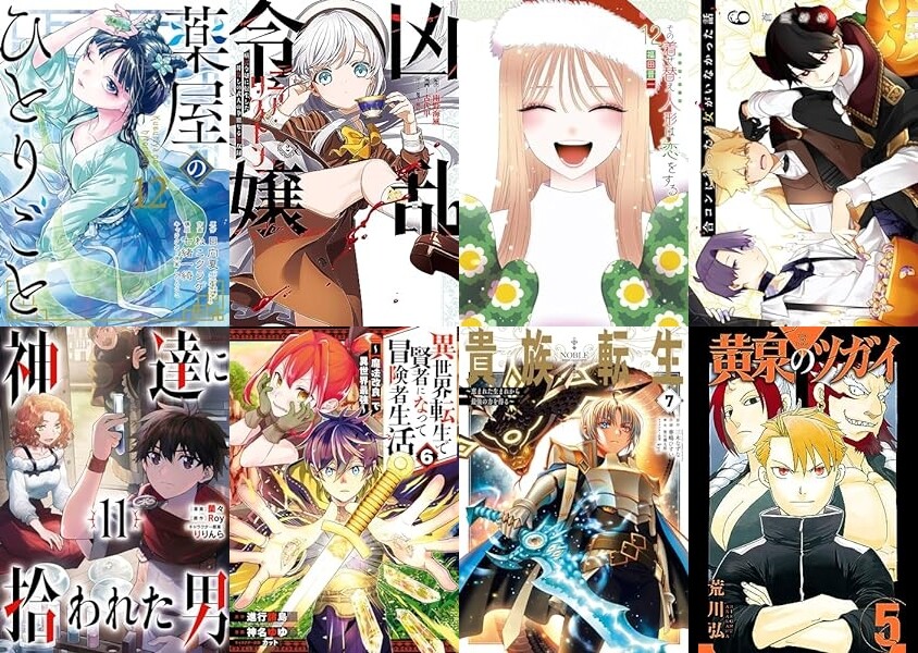 「薬屋のひとりごと」「凶乱令嬢ニア・リストン」「その着せ替え人形は恋をする」「合コンに行ったら女がいなかった話」「神達に拾われた男」「異世界転生で賢者になって冒険者生活」「黄泉のツガイ」「貴族転生」「ここは俺に任せて先に行けと言ってから10年がたったら伝説になっていた。」「役令嬢は溺愛ルートに入りました!?」「ラグナクリムゾン」「育成スキルはもういらないと勇者パーティを解雇されたので、退職金がわりにもらった【領地】を強くしてみる」「異世界賢者の転生無双」「処刑された賢者はリッチに転生して侵略戦争を始める」などなど。