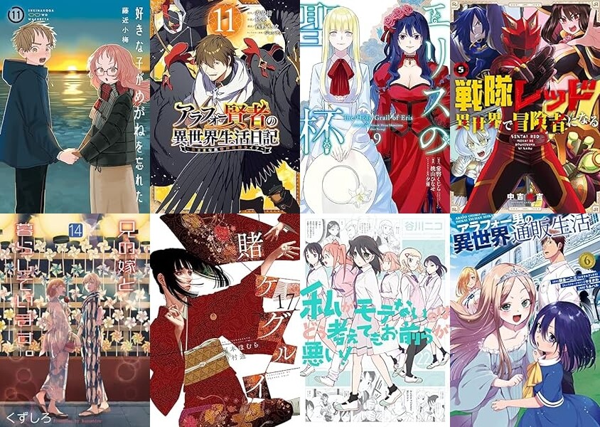 「好きな子がめがねを忘れた」「アラフォー賢者の異世界生活日記」「エリスの聖杯」「戦隊レッド」「兄の嫁と暮らしています。」「賭ケグルイ」「私がモテないのはどう考えてもお前らが悪い!」「アラフォー男の異世界通販生活」「ワンルーム、日当たり普通、天使つき。」「高校生WEB作家のモテ生活」「失格紋の最強賢者」などなど。