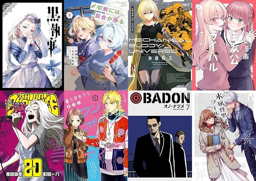 「黒執事」「〆切前には百合が捗る」「メカニカル バディ ユニバース」「ナイツ&マジック」「少女漫画主人公×ライバルさん」「SHIORI EXPERIENCE ジミなわたしとヘンなおじさん」「通りがかりにワンポイントアドバイスしていくタイプのヤンキー」「BADON」「氷属性男子とクールな同僚女子」「うちの息子はたぶんゲイ」「お近づきになりたい宮膳さん」などなど。