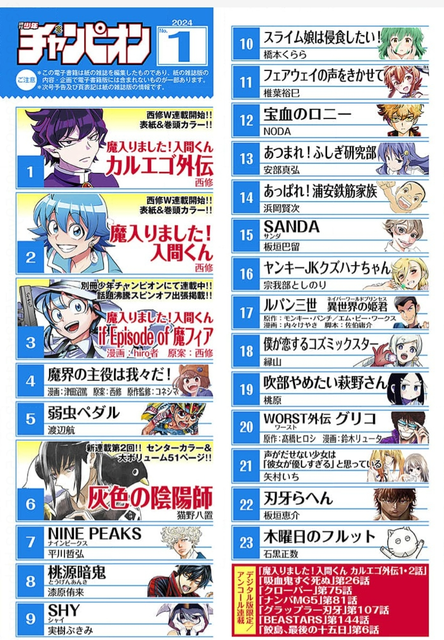 チャンピオン、週刊入間くんになりつつある 2023/12/8 ねいろ速報さん " " 名前:ねいろ速報 なんかチャンピオンが週刊入間くんになりつつある… 名前:ねいろ速報 1 気絶勇者はお休みか 名前:ねいろ速報 2 外伝始まるのは知ってたけど本編と同時並行かよ ていうかアニメの続きまだかよ 続きを読む Source: ねいろ速報さん