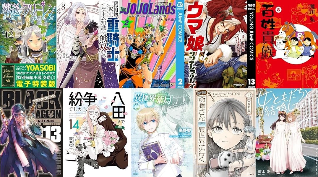 小学館「葬送のフリーレン(12)」「ブラック・ラグーン(13)」「トニカクカワイイ(26)」「MAJOR 2nd(メジャーセカンド)(27)」「異世界美少女受肉おじさんと(11)」「TSUYOSHI 誰も勝てない、アイツには(20)」「任侠転生-異世界のヤクザ姫-(13)」「龍と苺(14)」など、講談社「追放された転生重騎士はゲーム知識で無双する(8)」「恥じらう君が見たいんだ(7)」「紛争でしたら八田まで(14)」「焼いてるふたり(13)」「ちいかわ なんか小さくてかわいいやつ(6)」「僕は君たちを支配する(10)」など発売。