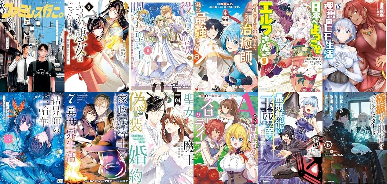 マンガでは、KADOKAWA「ファミレス行こ。 上」「結界師の一輪華 3」「地味で目立たない私は、今日で終わりにします。 6」「屋根裏部屋の公爵夫人 5」「服を着るならこんなふうに(15)」「妹に婚約者を譲れと言われました 最強の竜に気に入られてまさかの王国乗っ取り? 8」など、一迅社「ふつつかな悪女ではございますが ~雛宮蝶鼠とりかえ伝~: 6」「家政魔導士の異世界生活~冒険中の家政婦業承ります!~: 7」「嫌われ妻は、英雄将軍と離婚したい! いきなり帰ってきて溺愛なんて信じません。: 2」など発売。
