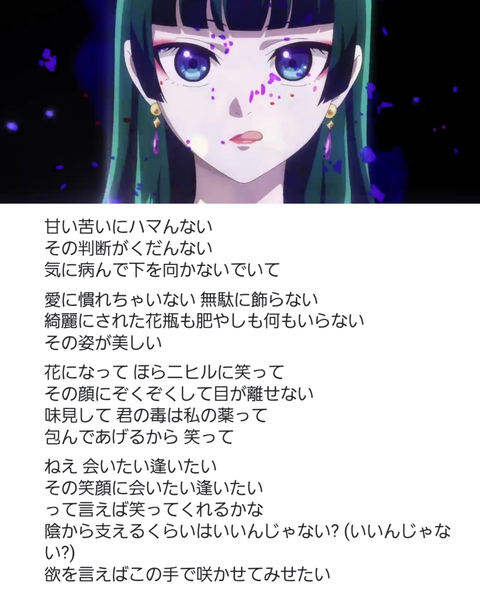 【薬屋のひとりごと】アニメOPの歌詞 2024/1/10 ねいろ速報さん " " 名前:ねいろ速報 壬氏様作詞っていうからちゃんと見たら きもかった 名前:ねいろ速報 1 特に後半やべえな 名前:ねいろ速報 2 キモすぎる… 続きを読む Source: ねいろ速報さん