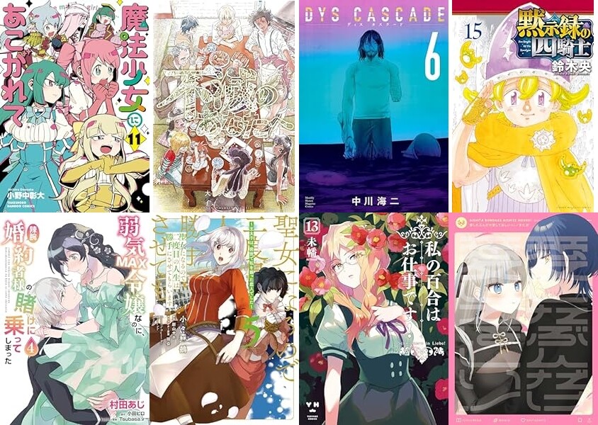 竹書房よりアニメ放送中「魔法少女にあこがれて (11)」や、講談社「不滅のあなたへ(21)」「DYS CASCADE(6)」「黙示録の四騎士(15)」「ドラハチ(3)」など、KADOKAWA「弱気MAX令嬢なのに、辣腕婚約者様の賭けに乗ってしまった 4」「聖女になるので二度目の人生は勝手にさせてもらいます 5」など、一迅社「私の百合はお仕事です!: 13」「愛したぶんだけ愛してほしいっ!」など発売です。
