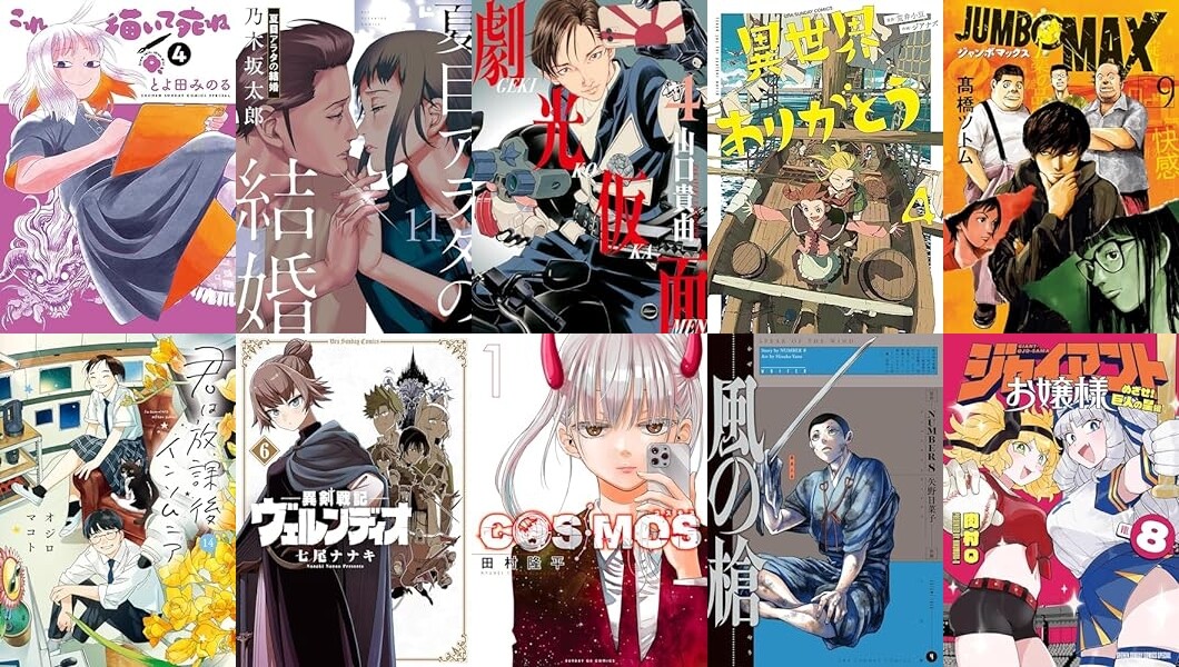 「これ描いて死ね」「夏目アラタの結婚」「劇光仮面」「異世界ありがとう」「JUMBO MAX~ハイパーED薬密造人~」「君は放課後インソムニア」「異剣戦記ヴェルンディオ」「COSMOS」「風の槍」「ジャイアントお嬢様」などなど。