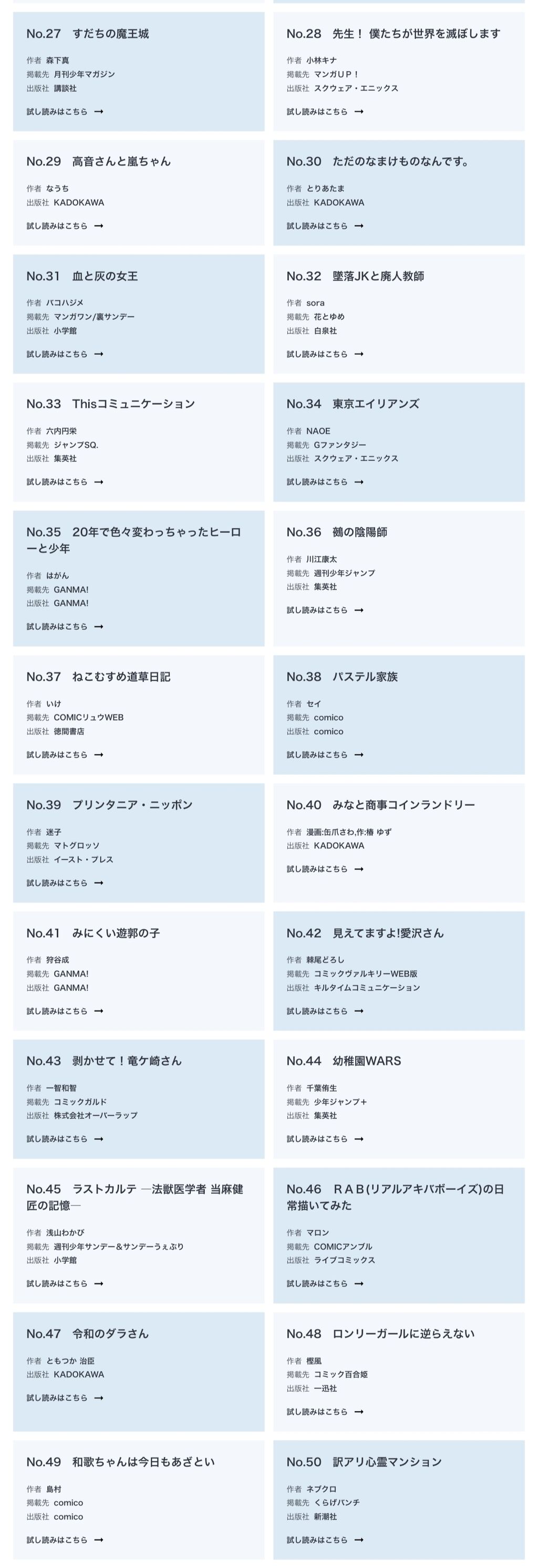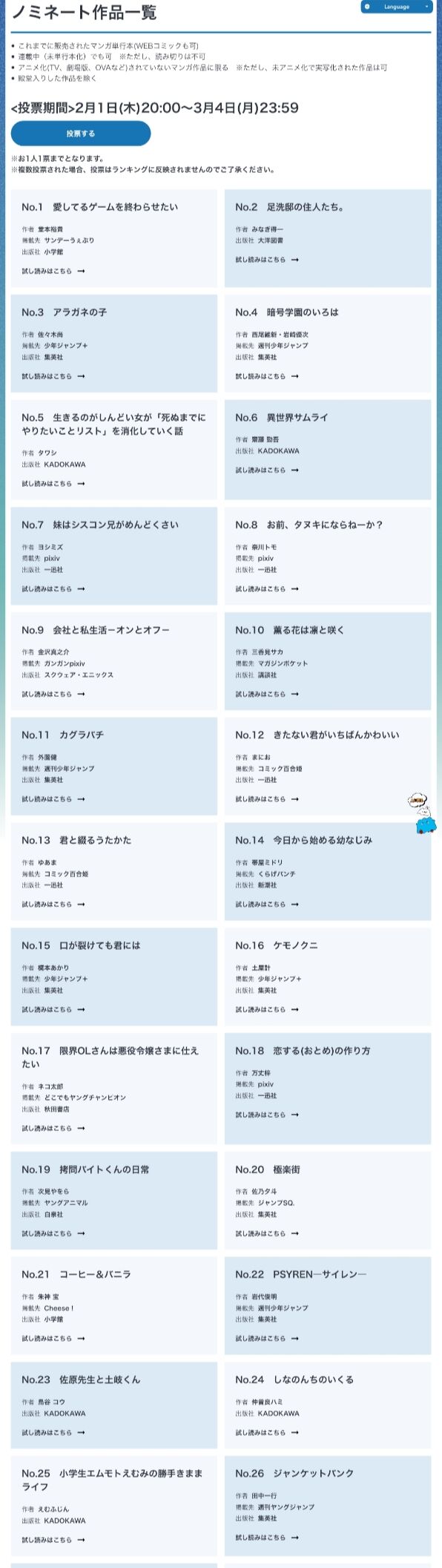 【悲報】「アニメ化してほしい漫画ランキング」のノミネート作品、ガチで聞いたことない【漫画】 2024/2/6 ジャンプ速報 " " 1: 以下、5ちゃんねるからVIPがお送りします 1作もわかんねえんだけどこれ俺がモグリなだけ? https://www.anime-japan.jp/activities/ajranking/ 続きを読む Source: ジャンプ速報