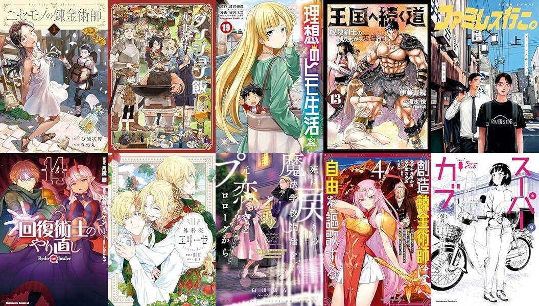 こちらでは、KADOKAWAコミックスをまとめました。ほぼ対象の作品のすべての巻がセールとなっています。「ニセモノの錬金術師」「ダンジョン飯」「理想のヒモ生活」「王国へ続く道 奴隷剣士の成り上がり英雄譚」「ファミレス行こ。」「回復術士のやり直し」「外科医エリーゼ」「死に戻りの魔法学校生活を、元恋人とプロローグから」「創造錬金術師は自由を謳歌する」「スーパーカブ」「年上エリート女騎士が僕の前でだけ可愛い」「元異世界転移者だった課長のおじさん、人生二度目の異世界を駆け廻る」などなど。