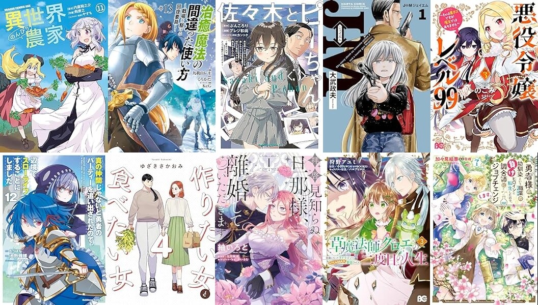 「異世界のんびり農家」「異世界のんびり農家の日常」「治癒魔法の間違った使い方」「佐々木とピーちゃん」「J⇔M ジェイエム」「悪役令嬢レベル99」「真の仲間じゃないと勇者のパーティーを追い出されたので、辺境でスローライフすることにしました」「作りたい女と食べたい女」「拝啓見知らぬ旦那様、離婚していただきます」「草魔法師クロエの二度目の人生」「勇者様の幼馴染という職業の負けヒロインに転生したので、調合師にジョブチェンジします。」などなど。