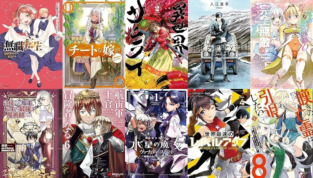 「無職転生 ~異世界行ったら本気だす~」「異世界でスキルを解体したらチートな嫁が増殖しました」「異世界サムライ」「北北西に曇と往け」「どうやら私の身体は完全無敵のようですね」「辺境ぐらしの魔王、転生して最強の魔術師になる」「航宙軍士官、冒険者になる」「機動戦士ガンダム 水星の魔女 ヴァナディースハート」「世界最速のレベルアップ」「嘆きの亡霊は引退したい」「陛下、心の声がだだ漏れです!」「役立たずスキルに人生を注ぎ込み25年、今さら最強の冒険譚」「ひげを剃る。そして女子高生を拾う。」などなど。