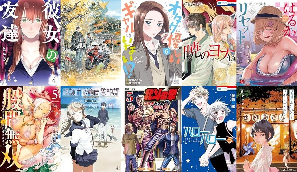 講談社「彼女の友達(4)」「股間無双~嫌われ勇者は魔族に愛される~(5)」「僕は君たちを支配する(11)」「底辺冒険者だけど魔法を極めてみることにした(5)」「雪と墨(4)」「攻殻機動隊 THE HUMAN ALGORITHM(6)」「タダでは抱かれません(9)」など、KADOKAWA「北北西に曇と往け 7」「鎮護庁祓竜局誓約課 2」「エレナの炬火 2」など発売。