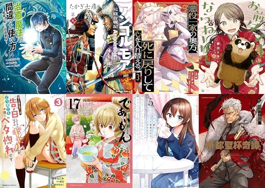 KADOKAWA「治癒魔法の間違った使い方 ~戦場を駆ける回復要員~(14)」「アンゴルモア 元寇合戦記 博多編 (9)」「悪役一家の奥方、死に戻りして心を入れ替える。 (3)」「陰キャの僕に罰ゲームで告白してきたはずのギャルが、どう見ても僕にベタ惚れです (3)」「であいもん(17)」「隣のクーデレラを甘やかしたら、ウチの合鍵を渡すことになった (5)」「帝都聖杯奇譚 Fate/type Redline(5)」「機動戦士ガンダムF90FF(11)」「夢見る男子は現実主義者(5)」「はじめてのギャル(18)」など、一迅社「お前、タヌキにならねーか?: 6」、小学館「クイーンズ・クオリティ(22)」など発売です。