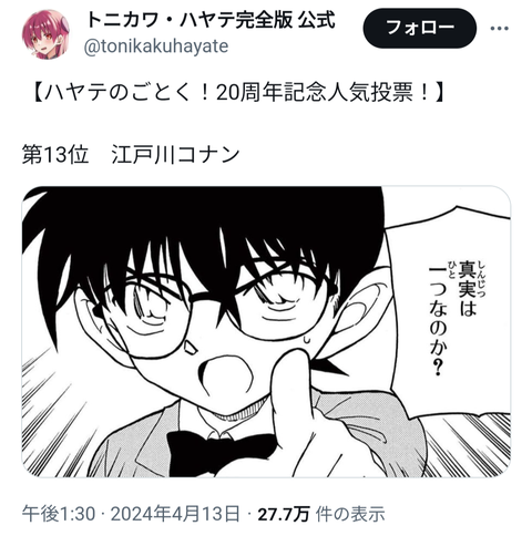 【ハヤテのごとく】20周年人気投票13位、江戸川コナン 2024/4/14 ねいろ速報さん " " 名前:ねいろ速報 第13位 名前:ねいろ速報 2 主人公なのに低いなと思ったら高かった 名前:ねいろ速報 5 江戸川コナンより人気のキャラが12人もいる作品 続きを読む Source: ねいろ速報さん
