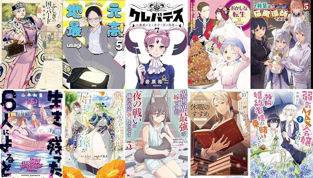 マンガでは、KADOKAWA「ふしぎの国のバード 11巻」「生き残った6人によると 6」「珍獣のお医者さん 2巻」「殺し屋の推し 2」「魔女のエデン 3」など、彩図社「地元最高!(5)」、LINE「クレバテス-魔獣の王と赤子と屍の勇者-7巻」、TOブックス「おかしな転生XI」「穏やか貴族の休暇のすすめ。10巻」「今日も絵に描いた餅が美味い 6巻」、マッグガーデン「婚約者の浮気現場を見ちゃったので始まりの鐘が鳴りました THE COMIC 2巻」、双葉社「異世界最強の嫁ですが、夜の戦いは俺の方が強いようです 3」「おっさん底辺治癒士と愛娘の辺境ライフ 8」など発売。