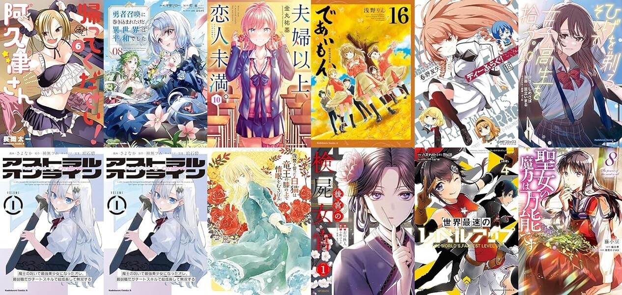 「帰ってください! 阿久津さん」「勇者召喚に巻き込まれたけど、異世界は平和でした」「夫婦以上、恋人未満。」「であいもん」「ディーふらぐ!」「アストラル・オンライン」「復讐を誓った白猫は竜王の膝の上で惰眠をむさぼる」「後宮の検屍女官」「世界最速のレベルアップ」「ひげを剃る。そして女子高生を拾う。」「戦闘員、派遣します!」「聖女の魔力は万能です」「皇帝の薬膳妃」「クラス最安値で売られた俺は、実は最強パラメーター」などなど。