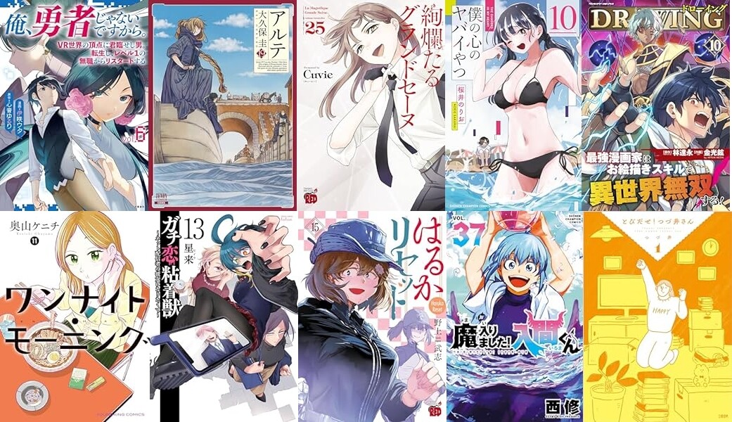 また秋田書店「絢爛たるグランドセーヌ」「はるかリセット」「明日クビになりそう」「秋山さんのとりライフ」「高嶺の華は乱れ咲き」「茉莉花官吏伝」「僕の心のヤバイやつ」「魔入りました!入間くん」「サイコ×パスト 猟奇殺人潜入捜査」「刃牙らへん」など、キルタイムコミュニケーション「ドローイング 最強漫画家はお絵描きスキルで異世界無双する!」など、文藝春秋「とびだせ! つづ井さん」など最新巻がセールです。