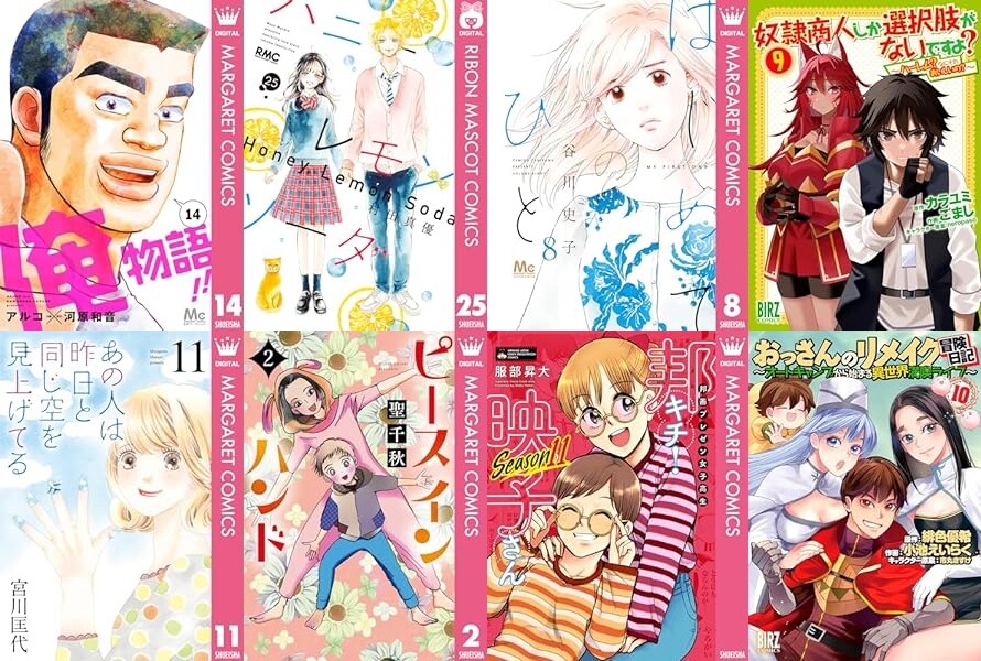 集英社「俺物語!! 14」「ハニーレモンソーダ 25」「はじめてのひと 8」「あの人は昨日と同じ空を見上げてる 11」「おとなの恋は、やぶさかにつき。 単行本版」など、幻冬舎「奴隷商人しか選択肢がないですよ? (9)」「おっさんのリメイク冒険日記 (10)」「精霊達の楽園と理想の異世界生活 (9)」など発売です。