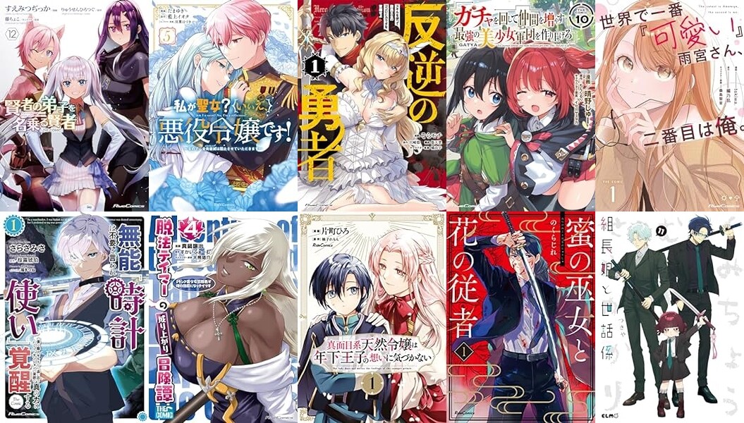 「賢者の弟子を名乗る賢者」「私が聖女?いいえ、悪役令嬢です!」「反逆の勇者」「ガチャを回して仲間を増やす 最強の美少女軍団を作り上げろ」「世界で一番『可愛い』雨宮さん、二番目は俺。」「無能は不要と言われ『時計使い』の僕は職人ギルドから追い出されるも、ダンジョンの深部で真の力に覚醒する」「脱法テイマーの成り上がり冒険譚」「真面目系天然令嬢は年下王子の想いに気づかない」「蜜の巫女と花の従者」「エロいスキルで異世界無双」「組長娘と世話係」「異世界転移したら愛犬が最強になりました」「失格から始める成り上がり魔導師道!」…などなど。