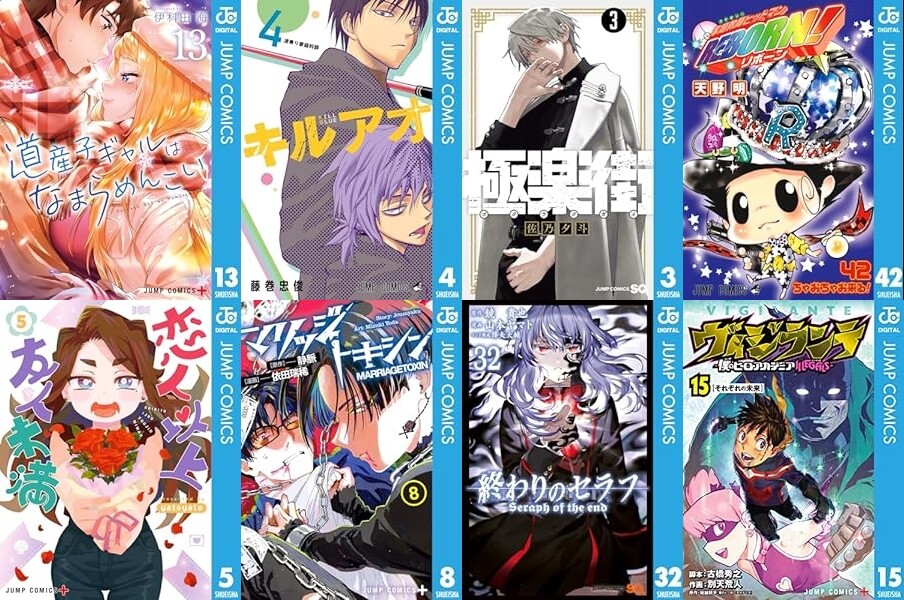 「道産子ギャルはなまらめんこい」「キルアオ」「恋人以上友人未満」「極楽街」「「All You Need Is Kill」「家庭教師ヒットマンREBORN! モノクロ版」「マリッジトキシン」「終わりのセラフ」「ヴィジランテ-僕のヒーローアカデミア ILLEGALS-」「左ききのエレン」「めだかボックス モノクロ版」「BLEACH 獄頤鳴鳴篇」などなど。