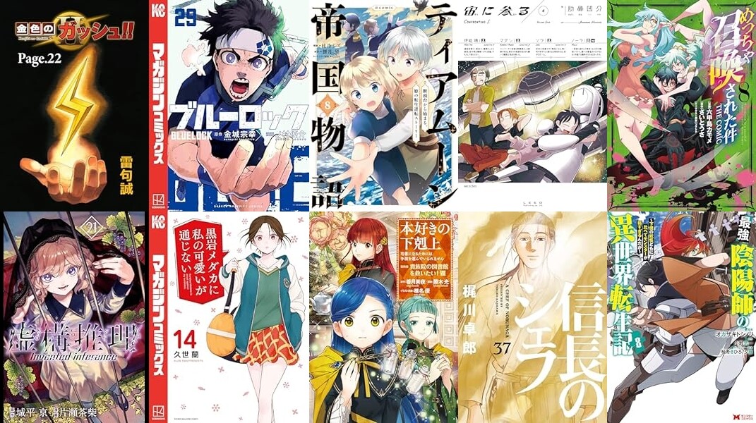 集英社「ブルーロック(29)」「虚構推理(21)」「黒岩メダカに私の可愛いが通じない(14)」「サンダー3(6)」「女神のカフェテラス(15)」「修羅の刻(21)」「戦隊大失格(14)」「ドラハチ(4)」「よわよわ先生(7)」「新 仮面ライダーSPIRITS(38)」など、TOブックス「ティアムーン帝国物語 第8巻」「本好きの下剋上 第四部 8」など発売。