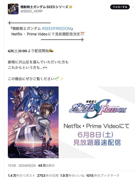 【超速報】「ガンダムSEED FREEDOM」ネトフリとアマプラで見放題配信! 2024/5/24 ねいろ速報さん " " 1: ねいろ速報 2: ねいろ速報 めっちゃ早いやん 7: ねいろ速報 ファッ!? 続きを読む Source: ねいろ速報さん