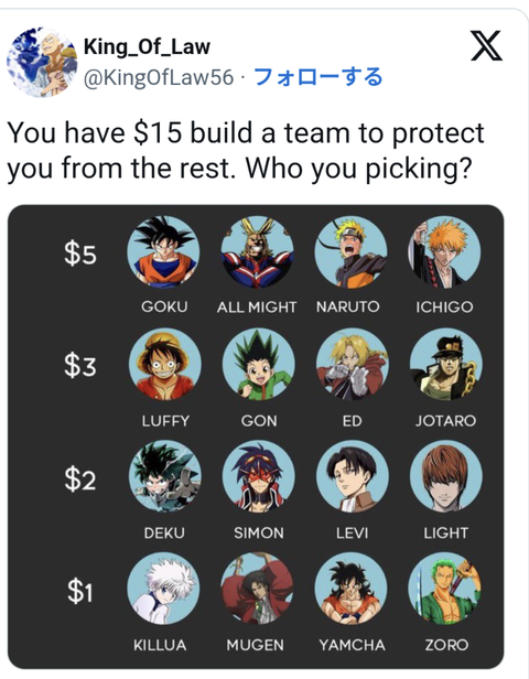 あなたは15ドルでこれらのキャラを護衛に雇えます 2024/5/25 ねいろ速報さん " " 名前:ねいろ速報 雇わなかった残りのキャラがあなたを殺しに行きます 名前:ねいろ速報 1 俺が何したって言うんだ 名前:ねいろ速報 2 悟空とナルトと月は確実に雇うとして… 続きを読む Source: ねいろ速報さん