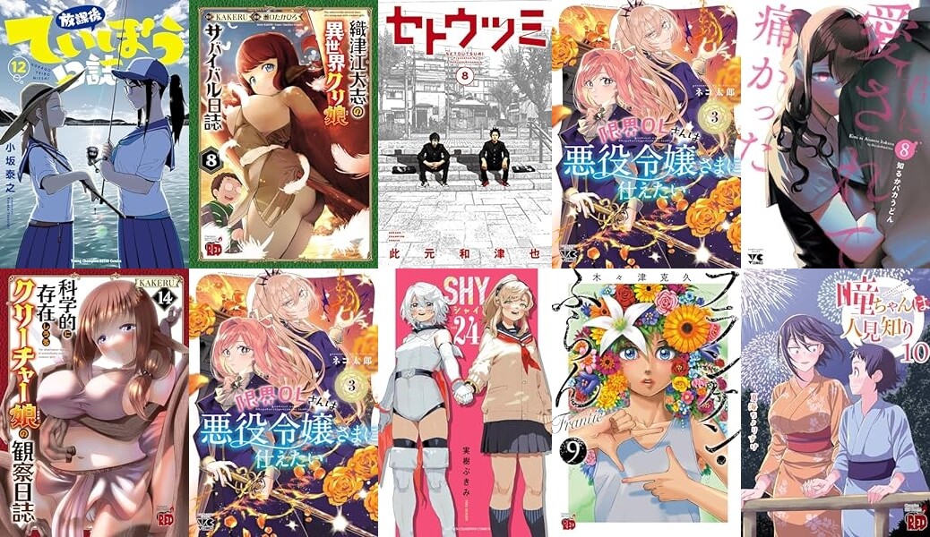「放課後ていぼう日誌」「科学的に存在しうるクリーチャー娘の観察日誌」「織津江大志の異世界クリ娘サバイバル日誌」「チチチチ」「セトウツミ」「限界OLさんは悪役令嬢さまに仕えたい」「フランケン・ふらん Frantic」「君に愛されて痛かった」「性食鬼 Aliens Meet Girls」「瞳ちゃんは人見知り」「酒と恋には酔って然るべき」「SHY」「SANDA」「明日の敵と今日の握手を」「あつまれ!ふしぎ研究部」「おかえり、パパ」「クラス≪無職≫の英雄譚」などなど。