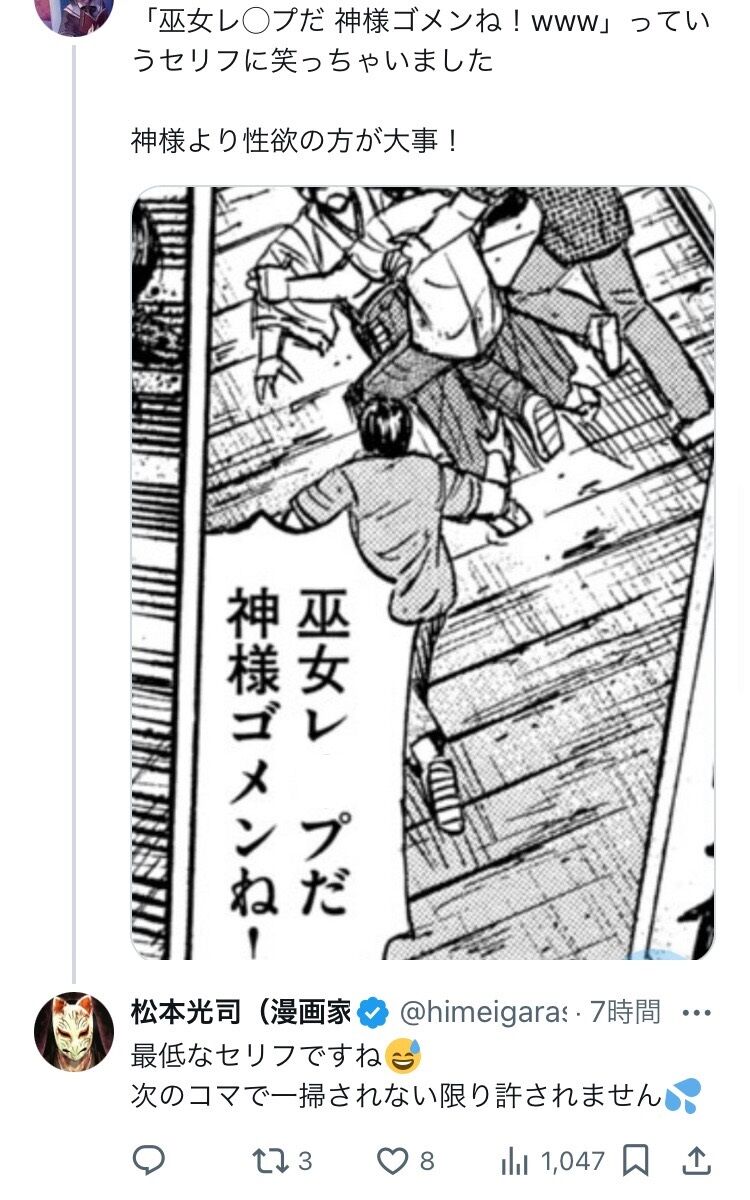 【悲報】「彼岸島」作者・松本光司先生ェ、自分で描いた漫画内の暴言に憤慨するwwww 2024/5/29 最強ジャンプ放送局 " " 1: 2024/05/28(火) 巫女レだ神様ゴメンね!は先生ェですら次のコマで死なないと許されない暴言とのこと 9: 2024/05/28(火) >>1 こんなにも声に出して読みたい日本語なのに… 8: 2024/05/28(火) >>1 令和のジキルとハイド 2: 2024/05/28(火) お前のはじめた物語だろうが 続きを読む Source: 最強ジャンプ放送局