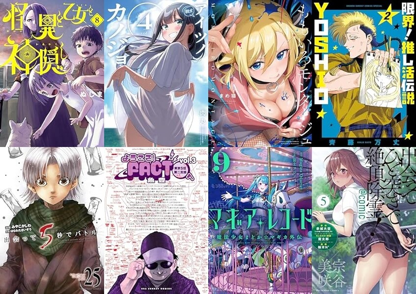 小学館「怪異と乙女と神隠し(8)」「アイツノカノジョ(4)」「出会って5秒でバトル(25)」「ようこそ!FACT(東京S区第二支部)へ(3)」「限界!推し活伝説 YOSHIO(2)」「出会ってひと突きで絶頂除霊!@comic(5)」「変人のサラダボウル@comic(5)」など、芳文社「ももいろモンタージュ 4巻」「マギアレコード 魔法少女まどか☆マギカ外伝 9巻」など発売です。