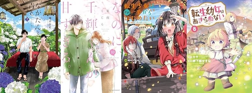講談社「ながたんと青と-いちかの料理帖-(12)」「なのに、千輝くんが甘すぎる。(10)」「涙雨とセレナーデ(12)」「稲妻とロマンス(6)」「カワイイなんて聞いてない!!(9)」「この恋、茶番につき!?(10)」「ハイスペ弁護士との同居生活は最低で最高です。(5)」「沼すぎてもはや恋(5)」など、マッグガーデン「転生少女はまず一歩からはじめたい 5巻」「転生幼女はあきらめない 8巻」「商人勇者は異世界を牛耳る! 10巻」「器用貧乏、城を建てる 4巻」など、徳間書店「ブルターニュ花嫁異聞(4)」「ZINGNIZE(11)」など発売です。