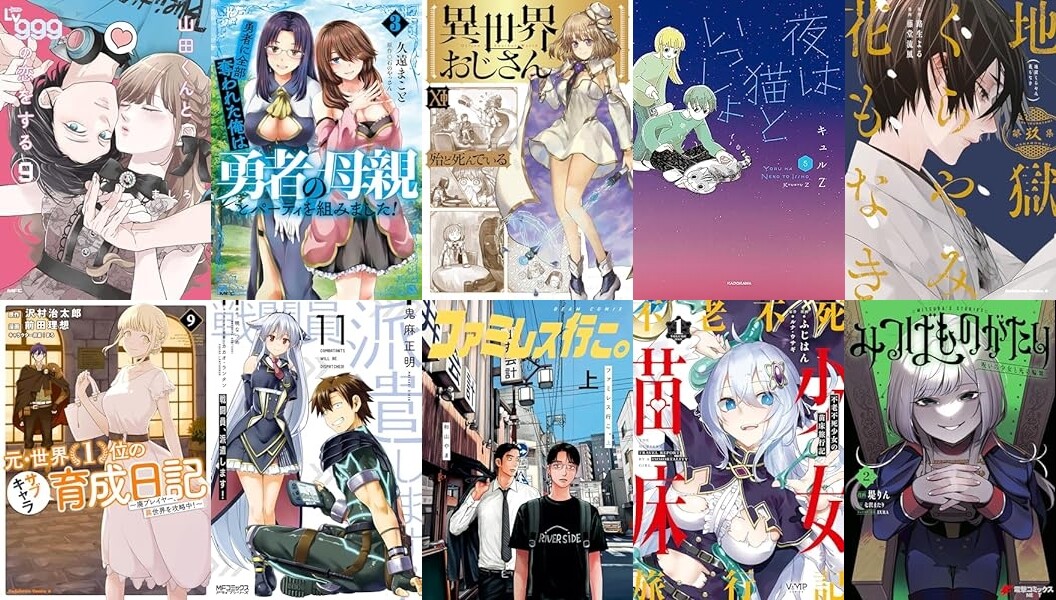 「山田くんとLv999の恋をする」「勇者に全部奪われた俺は勇者の母親とパーティを組みました!」「異世界おじさん」「夜は猫といっしょ」「地獄くらやみ花もなき」「元・世界1位のサブキャラ育成日記」「戦闘員、派遣します!」「ファミレス行こ。」「カラオケ行こ!」「不老不死少女の苗床旅行記」「みつばものがたり」「悪役令嬢(仮)の奮闘」「たとえば俺が、チャンピオンから王女のヒモにジョブチェンジしたとして。」「妹に婚約者を譲れと言われました」「宮廷鍛冶師の幸せな日常」などなど。