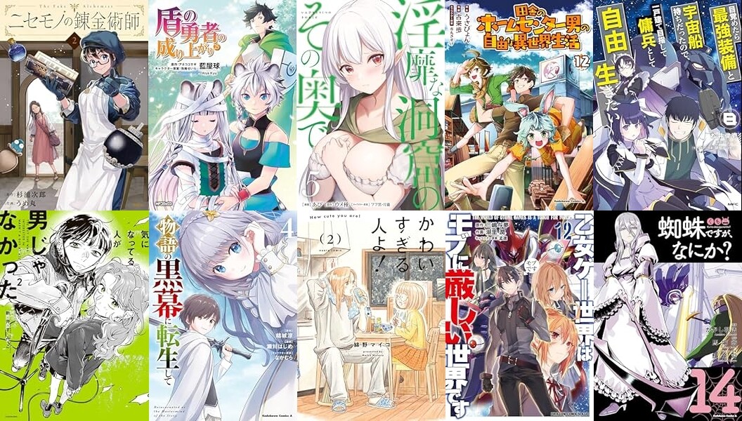 「ニセモノの錬金術師」「盾の勇者の成り上がり」「淫靡な洞窟のその奥で」「田舎のホームセンター男の自由な異世界生活」「目覚めたら最強装備と宇宙船持ちだったので、一戸建て目指して傭兵として自由に生きたい」「気になってる人が男じゃなかった」「物語の黒幕に転生して」「かわいすぎる人よ!」「乙女ゲー世界はモブに厳しい世界です」「トリアージX」「蜘蛛ですが、なにか?」「アイドル辞めるけど結婚してくれますか!?」などなど。