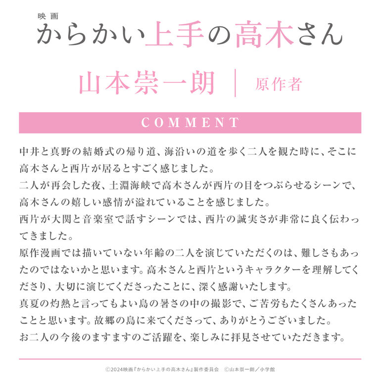 【朗報】高木さん作者「そこに高木さんと西片が居ました。実写版を演じたお二人に深く感謝致します」 2024/6/21 ジャンプ速報 " " 1: 2024/06/21(金) 14:16:23.33 実写化成功して良かった☺ 映画『#からかい上手の高木さん』 大ヒット御礼舞台挨拶で紹介された 原作者 #山本崇一朗 先生から #永野芽郁 さん #高橋文哉 さんへの メッセージ✍ 続きを読む Source: ジャンプ速報