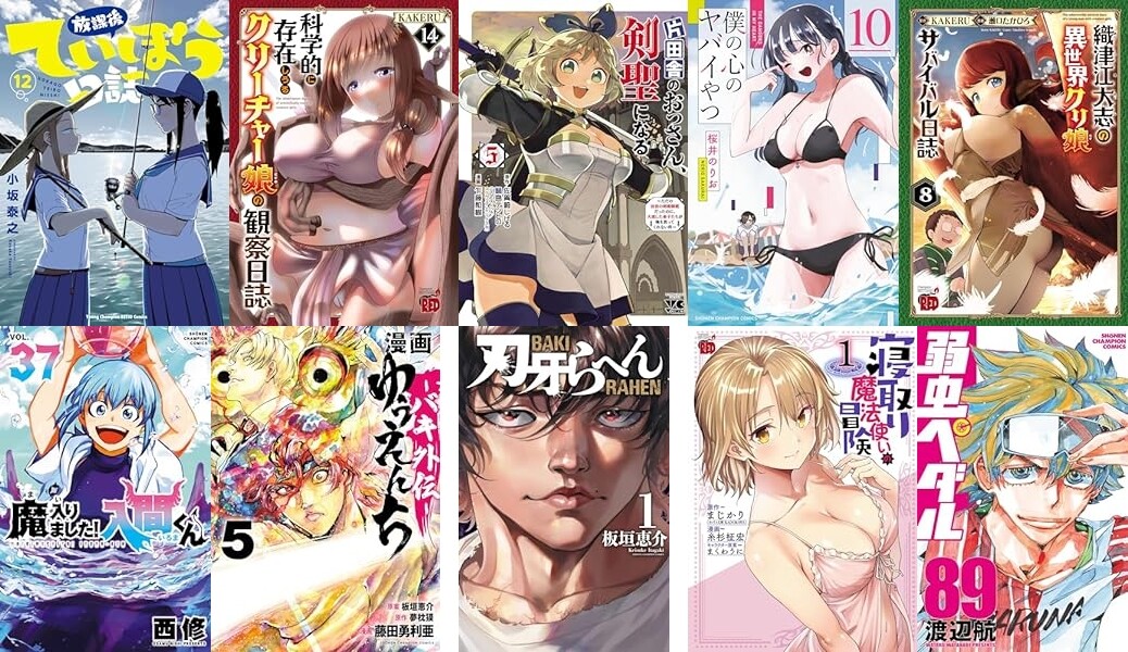 アニメ化もされた釣りマンガ「放課後ていぼう日誌」、クリーチャー娘とのイチャラブハーレム「科学的に存在しうるクリーチャー娘の観察日誌」、人気成り上がり「片田舎のおっさん、剣聖になる」に人気恋愛モノ「僕の心のヤバイやつ」、ほかにも「魔入りました!入間くん」「漫画 ゆうえんち -バキ外伝-」「刃牙らへん」などセールです。