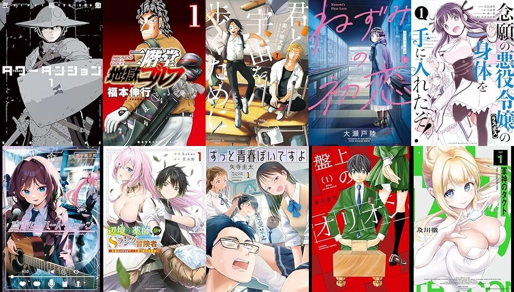 弐瓶勉さん最新作ファンタジー「タワーダンジョン」、正反対の2人を描く友情マンガ「君と宇宙を歩くために」、愛を知らない少女の初恋物語「ねずみの初恋」、福本伸行さん最新作のゴルフ道「二階堂地獄ゴルフ」、ほか「念願の悪役令嬢の身体を手に入れたぞ!」「真夜中ハートチューン」「辺境の薬師、都でSランク冒険者となる」「ずっと青春ぽいですよ」「盤上のオリオン」「軍神のタクト」などなど。