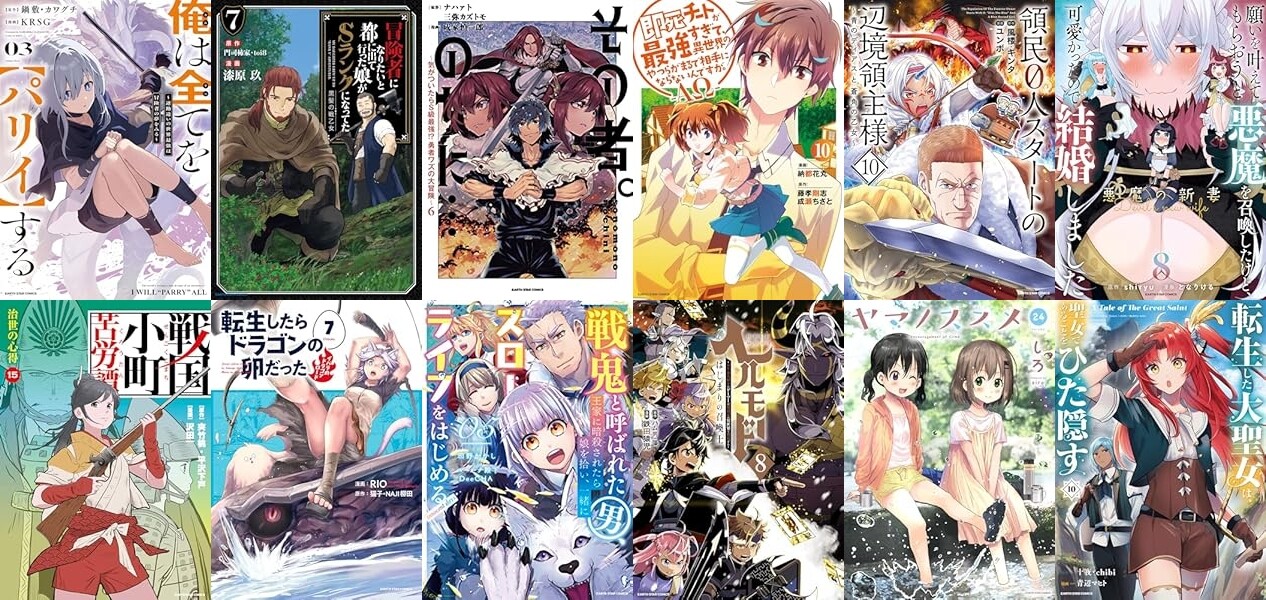 「俺は全てを【パリイ】する」「冒険者になりたいと都に出て行った娘がSランクになってた」「その者。のちに…」「即死チートが最強すぎて、異世界のやつらがまるで相手にならないんですが。」「領民0人スタートの辺境領主様」「願いを叶えてもらおうと悪魔を召喚したけど、可愛かったので結婚しました」「戦国小町苦労譚」「転生したらドラゴンの卵だった」「戦鬼と呼ばれた男、王家に暗殺されたら娘を拾い、一緒にスローライフをはじめる」「ヘルモード」「ヤマノススメ」「転生した大聖女は、聖女であることをひた隠す」「転生してハイエルフになりましたが、スローライフは120年で飽きました」「異世界に転移したら山の中だった。反動で強さよりも快適さを選びました。」「生まれた直後に捨てられたけど、前世が大賢者だったので余裕で生きてます」などなど。
