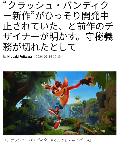 クラッシュバンディクー新作、開発中止か 2024/7/17 ねいろ速報さん " " 名前:ねいろ速報 ええ… 名前:ねいろ速報 1 クラッシュ・万事休す 名前:ねいろ速報 4 >>1 この歌聞くと元気出るよ 続きを読む Source: ねいろ速報さん