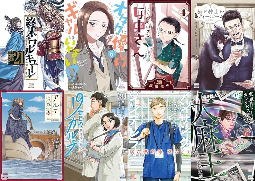 「終末のワルキューレ」「オタクに優しいギャルはいない!?」「うちのちいさな女中さん」「猫と紳士のティールーム」「アルテ」「19番目のカルテ 徳重晃の問診」「アンサングシンデレラ 病院薬剤師 葵みどり」「東京カンナビス特区 大麻王と呼ばれた男」「ガチ恋粘着獣」「夜分に吸血失礼します。」「めしぬま。」「フィルター越しのカノジョ」などなど。