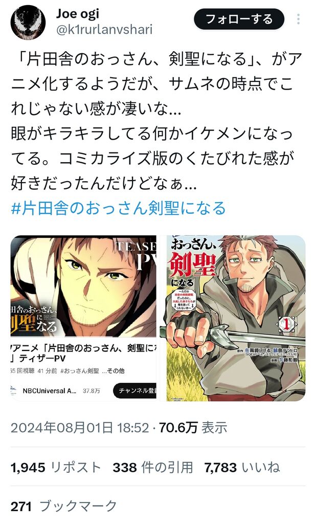 【悲報】「片田舎のおっさん、剣聖になる」のアニメ化が決定するもおっさんのイケメン化にファンが絶望【片田舎のおっさん、剣聖になる】 2024/8/4 ジャンプ速報 " " 1: 以下、5ちゃんねるからVIPがお送りします かわいそう😭 続きを読む Source: ジャンプ速報