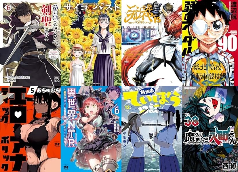 「片田舎のおっさん、剣聖になる」「サイコ×パスト 猟奇殺人潜入捜査」「もういっぽん!」「ニンジャスレイヤー・キョート・ヘル・オン・アース」「売れ残りの奴隷エルフを拾ったので、娘にすることにした」「エロティック×アナボリック」「弱虫ペダル」などなど。