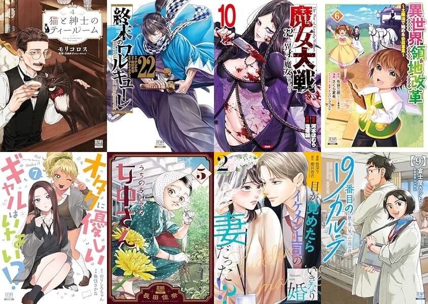 今回のセールでは、8月20日発売「猫と紳士のティールーム 4巻」が予約中ながら40%還元となっていて、さらに「終末のワルキューレ」「さるまね」「魔女大戦」「異世界領地改革」など7月発売の新刊もセールとなっています。