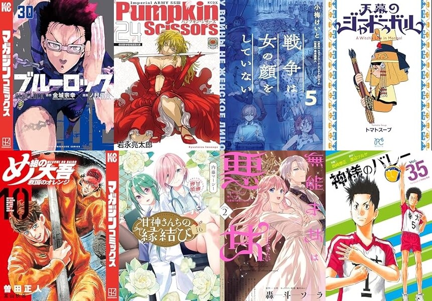 講談社「ブルーロック(30)」「Pumpkin Scissors(24)」「め組の大吾 救国のオレンジ(10)」「Q.E.D.iff ―証明終了―(28)」「聖女に嘘は通じない(3)」「甘神さんちの縁結び(16)」「EDENS ZERO(33)」「ないない堂 ~タヌキ和尚の禍事帖~(4)」「無敗のふたり(1)」など、KADOKAWA「戦争は女の顔をしていない 5」「無能才女は悪女になりたい 2」「わたくしのことが大嫌いな義弟が護衛騎士になりました 2」「後宮妃の管理人 8」「軍神の花嫁 2」など発売。