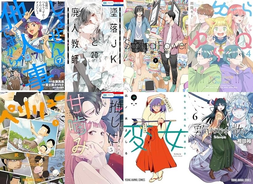 ドラマ化「しょせん他人事ですから」は最新7巻が対象。花とゆめコミックス「墜落JKと廃人教師」「ゆらゆらQ」「推しに甘噛み」など、楽園コミックス「Spotted Flower」など、ヤングアニマルコミックス「ペリリュー」「変女~変な女子高生 甘栗千子~」「勇気あるものより散れ」