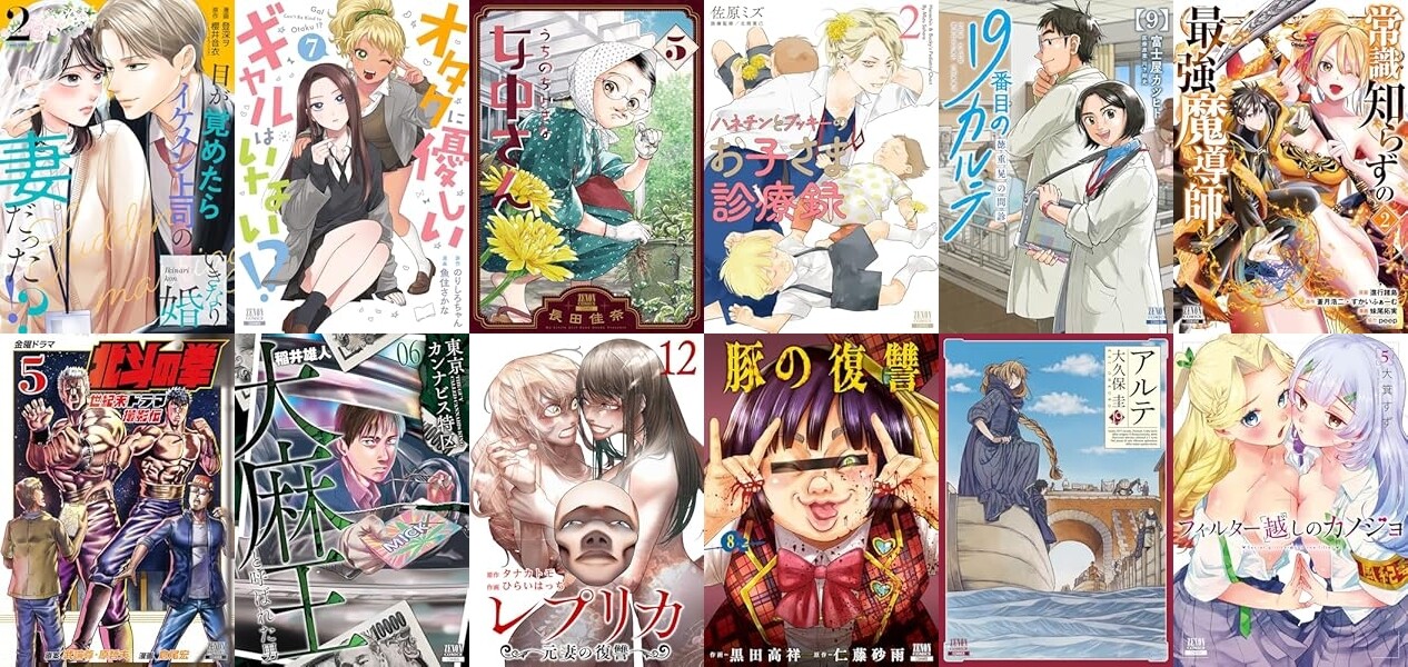 「いきなり婚 目が覚めたらイケメン上司の妻だった!?」「オタクに優しいギャルはいない!?」「うちのちいさな女中さん」「ハネチンとブッキーのお子さま診療録」「19番目のカルテ 徳重晃の問診」「常識知らずの最強魔導師」「北斗の拳 世紀末ドラマ撮影伝」「東京カンナビス特区 大麻王と呼ばれた男」「レプリカ 元妻の復讐」「豚の復讐」「アルテ」「フィルター越しのカノジョ」など、25作品以上をまとめました。