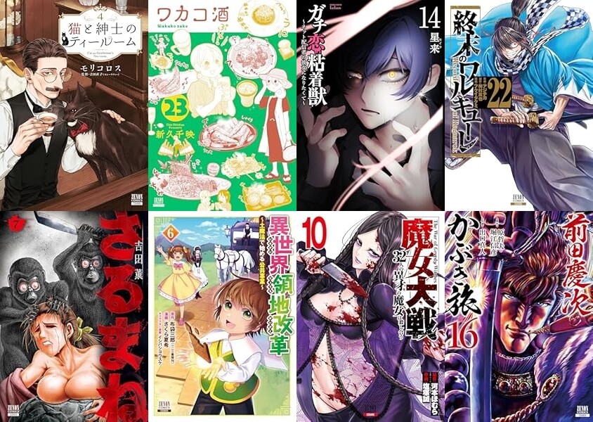2024年8月以前発売のほぼすべての作品・巻がセールの模様。2024年8月発売「猫と紳士のティールーム」「ワカコ酒」「ガチ恋粘着獣」最新巻は40%ポイント還元のほか、「終末のワルキューレ」「さるまね」「異世界領地改革」「魔女大戦」「モグランド」「ジャック・ザ・リッパーの事件簿」「前田慶次 かぶき旅」「嫌われ者の悪役令嬢アリーシャ・リブラはまげられない」など対象。
