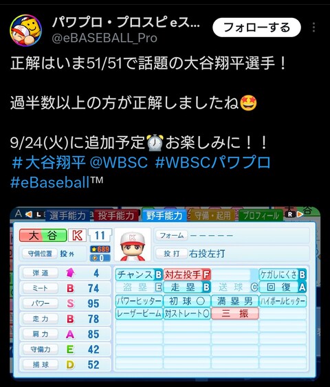 パワプロの大谷翔平www 2024/9/23 ねいろ速報さん " " 名前:ねいろ速報 大谷翔平選手! 名前:ねいろ速報 1 チャンスBかなぁ? 名前:ねいろ速報 2 チャンス下げて盗塁爆上げさせないと… 続きを読む Source: ねいろ速報さん
