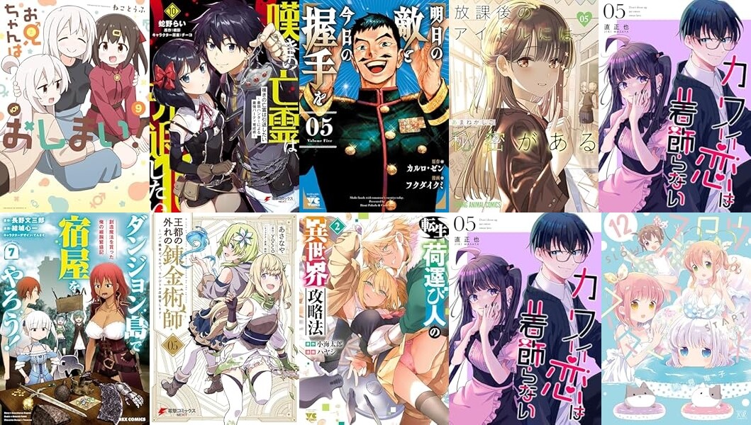 一迅社「お兄ちゃんはおしまい!: 9」「ダンジョン島で宿屋をやろう! 創造魔法を貰った俺の細腕繁盛記: 7」「『お前を追放する』追放されたのは俺ではなく無口な魔法少女でした: 2」「お兄ちゃんはおしまい! 公式アンソロジーコミック: 5」など、KADOKAWA「嘆きの亡霊は引退したい(10)」「王都の外れの錬金術師 5」「死神に育てられた少女は漆黒の剣を胸に抱く8」「ケイヤクシマイ 4」「わたし、二番目の彼女でいいから。 2」「嫌われ皇子のやりなおし(4)」「拝啓…殺し屋さんと結婚しました 7」「後宮の検屍女官 3」「僕と君が夫婦になるまで(2)」「ある魔女が死ぬまで 3」「10年間友達だと思ってた男の子に告白されるお話7」など発売。